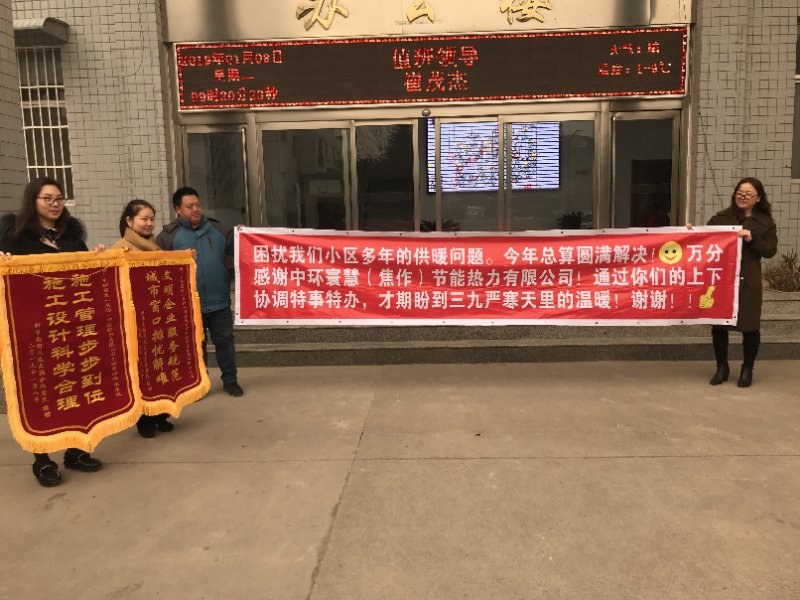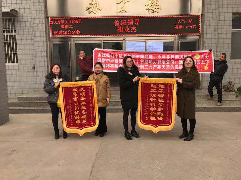 2019年1月8日上午,中环寰慧(焦作)公司经营管理部、工程管理部收到了来自新华南街凤凰家园全体居民送来的两面锦旗——文明企业服务规范、城市窗口排忧解难;施工管理步步到位、施工设计科学合理,赞扬热力公司多方协调,特事特办,终于解决了困扰该小区多年的用暖问题,为小区居民排忧解难,送去严寒中的温暖。该小区位于老城区新华南街,多年未供暖,小区居民对暖气的渴望十分强烈,但是由于历史原因,小区供暖设施建设迟迟不能完成。2018年,在热力公司总经理助理于文通、用户发展中心主任张军杰、工程管理部经理张宗辰的多方努力下,终于圆满完成了一次管网、换热站的设施建设,小区居民特送来锦旗以表达感激之情。