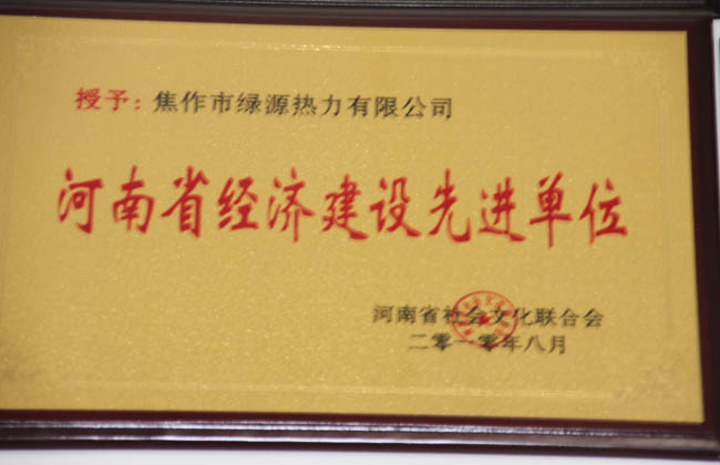 焦作市绿源热力有限公司荣获河南省社会文化联合会颁发的“河南省经济建设先进单位”奖。