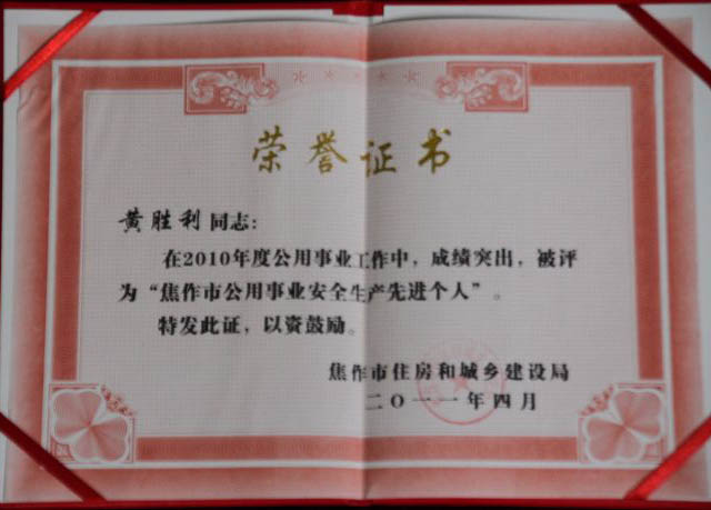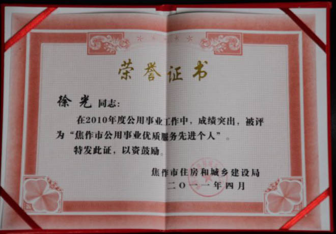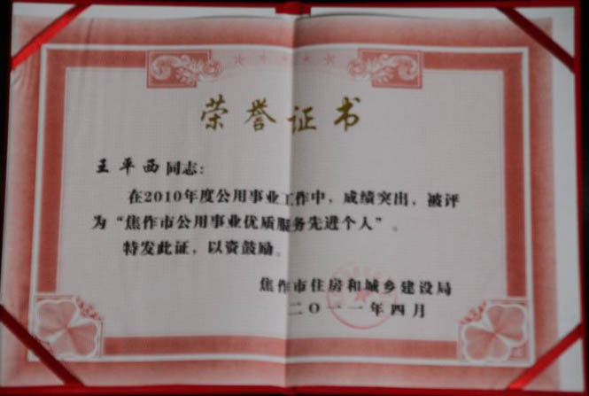 在市住房和城乡建设局组织的2010年度公用事业工作中,我公司徐光、王平西同志被评为“焦作市公用事业优质服务先进个人”;黄胜利同志被评为“焦作市公用事业安全生产先进个人”。