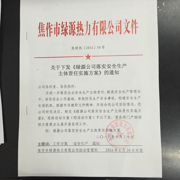 以《中华人民共和国安全生产法》、《河南省人民政府安全生产委员会关于强化和落实生产经营单位安全生产主体责任的通知》(豫安委[2016]8号)、《中共市委人民政府关于加强安全生产工作的实施意见》(焦发【2014】11号)、《焦作市住房和城乡建设局关于做好公用事业企业安全生产主体责任工作的通知》(焦建公【2016】11号)为行动准则,牢固确立“安全第一、预防为主、综合治理”的宗旨,强化企业安全生产主体责任意识,改善安全生产条件和环境,促进企业更好更平稳的发展。