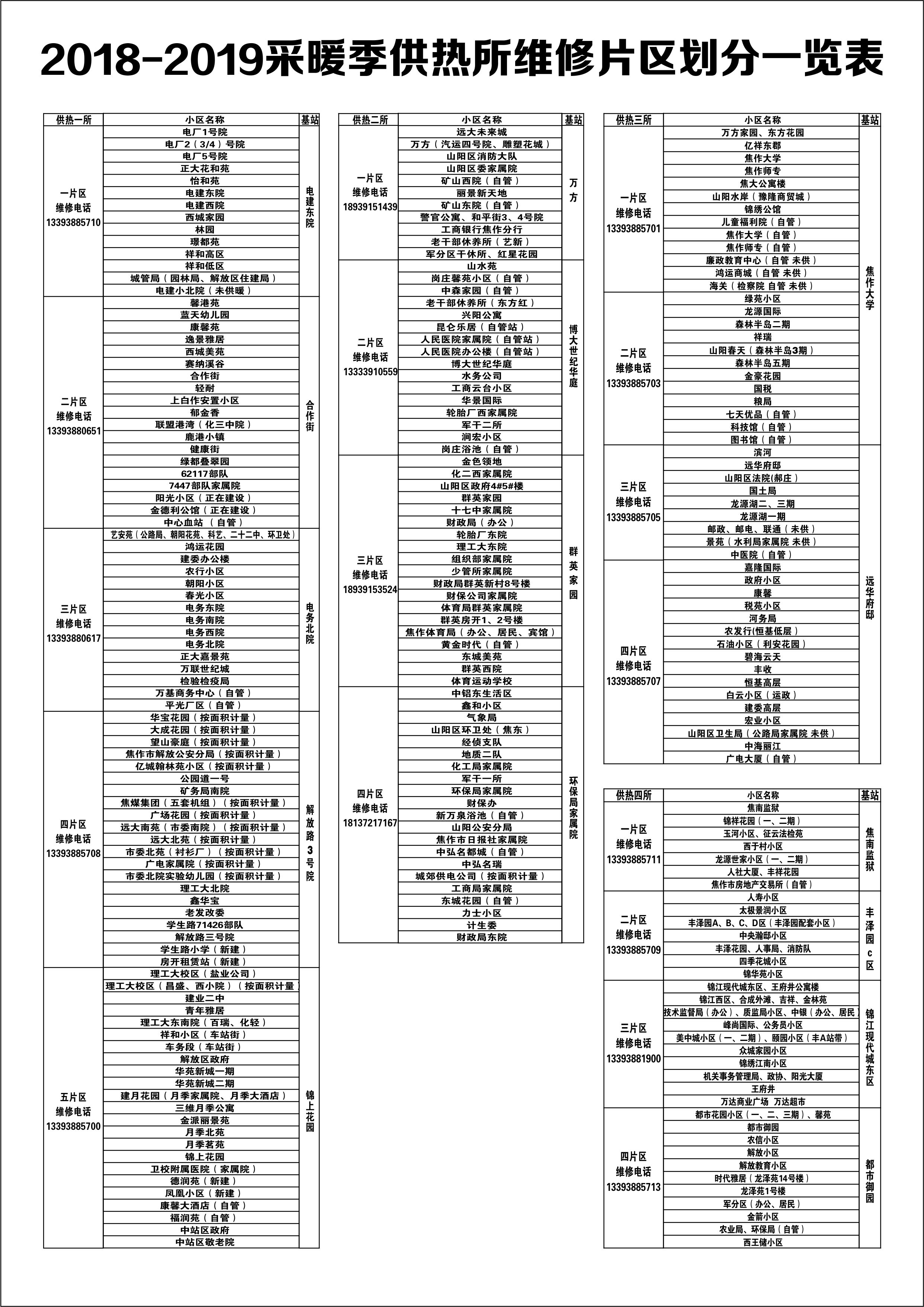 热力公司再次提醒集中供热报修电话为3681088、13393880615、18939152421,各片区维修服务电话详见下图(可点击放大):