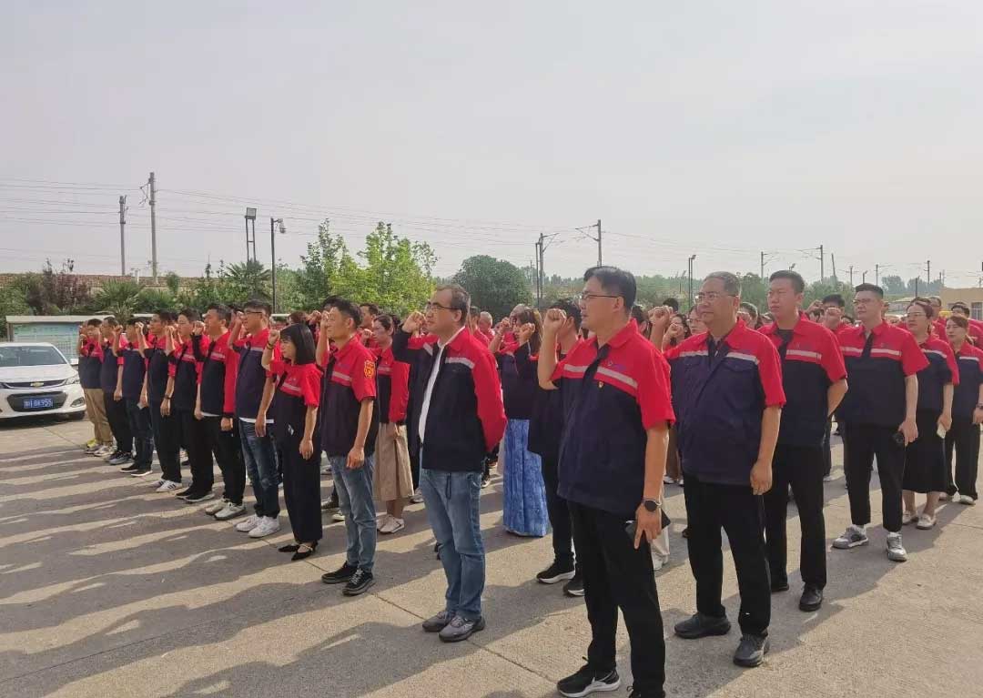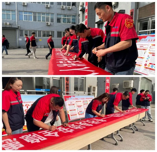 在宣誓环节,领誓人带领全体人员庄严宣誓:"我郑重承诺,严格遵守安全法规、执行安全制度、规范操作流程、提高安全技能,查找身边安全隐患,确保安全生产……"响亮而坚定的誓言在操场上空回荡,字字句句都彰显着员工们对安全生产的坚定决心。宣誓完毕后,参会人员依次在"人人讲安全、个个会应急——查找身边安全隐患"的主题条幅上郑重签下姓名,以签名承诺的形式,将安全生产的责任担当牢牢铭刻在每一个落笔之处。