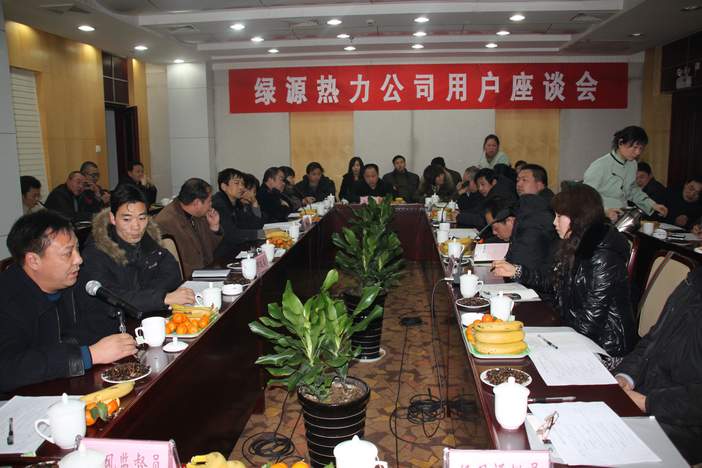 2010年元月8日下午,绿源热力有限公司在东方宾馆四楼第五会议室召开了2010年第一次用户代表座谈会。公司书记金凯及各部门负责人参加了此次座谈会,与来自各小区用户代表、开发商、物业、施工单位、行风监督员、行风评议代表、民生大厅以及焦作电视台、焦作日报、焦作广播电视报等新闻媒体的记者等近40位代表一起,就集中供热服务、庭院管网、供热工程、用户发展等进行了座谈。