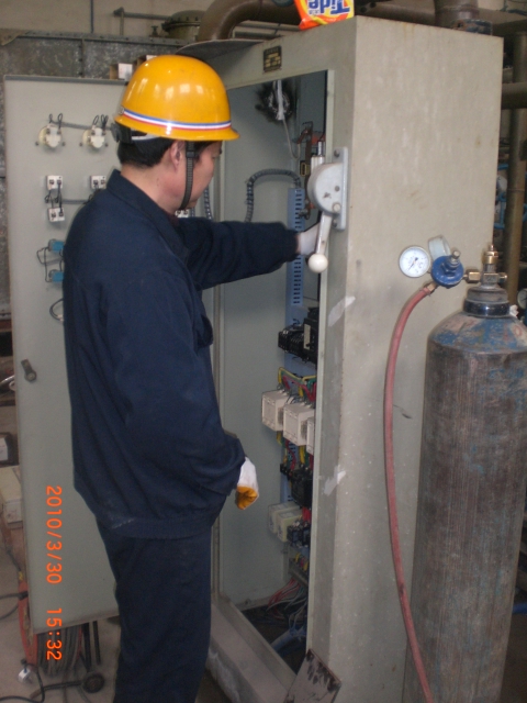 (7)对配电柜内各种开关、交流接触器、过流保护器进行检查,线头松紧检查,线路规范检查,如有损坏必须更换,最后用压缩空气吹灰保养;