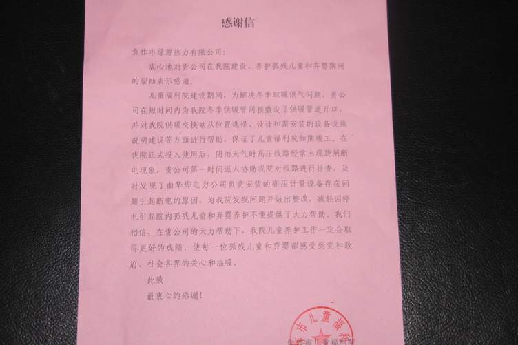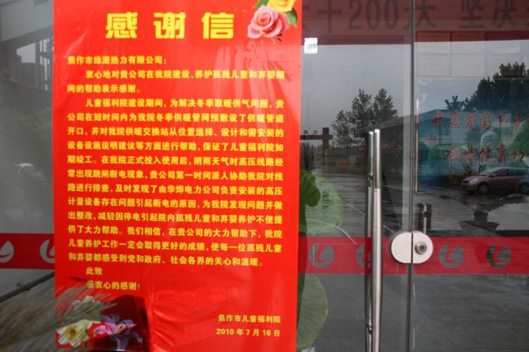 2010年7月19日上午,焦作市儿童福利院李院长带队一行4人来到绿源热力公司,对绿源公司在儿童福利院建设、养护孤残儿童和弃婴期间的帮助表示感谢!