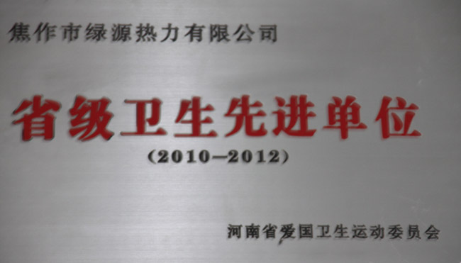 此次省级卫生先进单位评选活动是省爱卫会自2009年5月份开始,在全省范围内组织开展的,焦作市绿源热力有限公司在焦作市住房与城乡建设局的正确领导下,在焦作市爱卫会的认真指导下,精心组织、积极参与,由公司爱卫办、综合办牵头,全厂动员,认真迎查,经省协作组初审、专家组复审,在最终的评审中同全省其他303家单位一并被授予“省级卫生先进单位”称号。