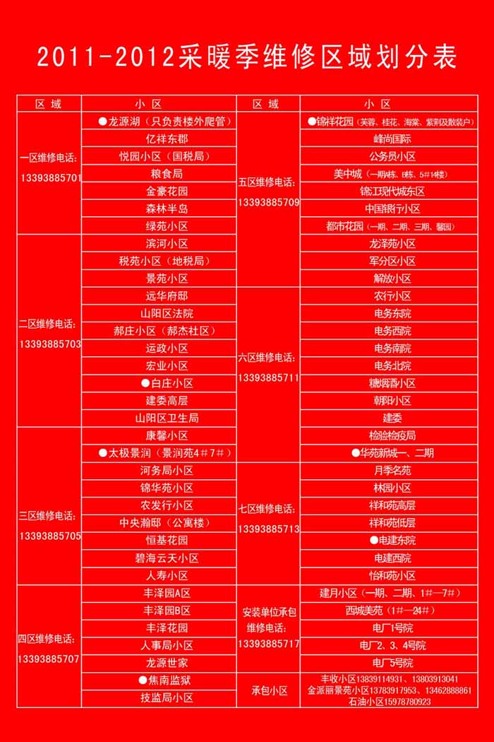 绿源公司今年在正常开通3681088报修电话的基础上,采取报修电话服务下小区方式,将用户服务范围分为八个片区,在每个片区另外设立一个报修移动电话,方便居民及时报修,具体划分请见下表: