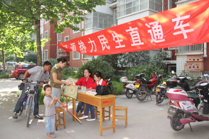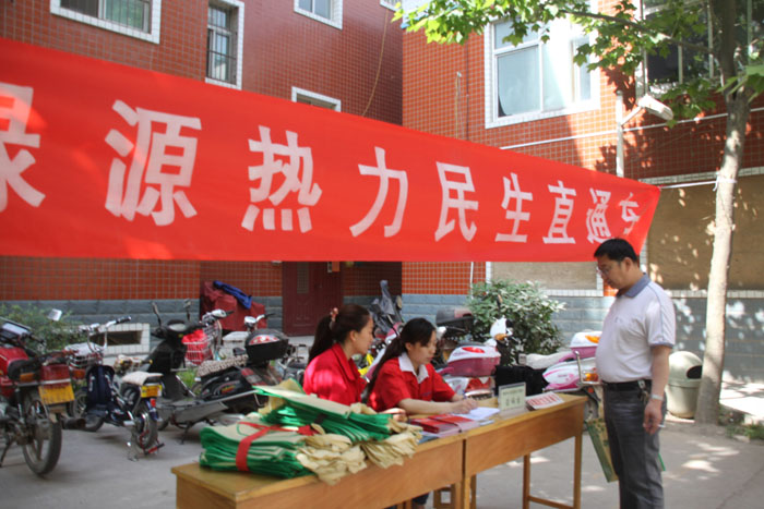 绿源公司民生工作室把这次民生直通车进社区宣传服务活动作为民生工作的推进剂,深入与群众交流,并作为与用户联系的纽带和沟通桥梁。参与直通车的相关服务人员深入小区,开展为民服务活动。直通车现场,我们悬挂了宣传条幅和宣传展板,向群众宣传集中供热的常识和政策,并向用户发放热用户服务手册,现场设置咨询台,解答群众的咨询及用户提出的问题、发放小礼品等,记录汇编用户意见和建议,同时配合公司经营科热表升级工作,现场为用户解决遇到的问题。