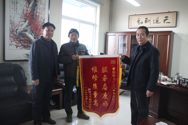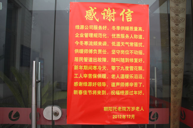 为答谢绿源热力有限公司几年来对焦作市朝阳托老院在各方面的关爱和支持,2012年12月31日上午,焦作市朝阳托老院到绿源热力有限公司赠送“服务态度好、维修质量高”的锦旗,并附上感谢信,以示谢意。