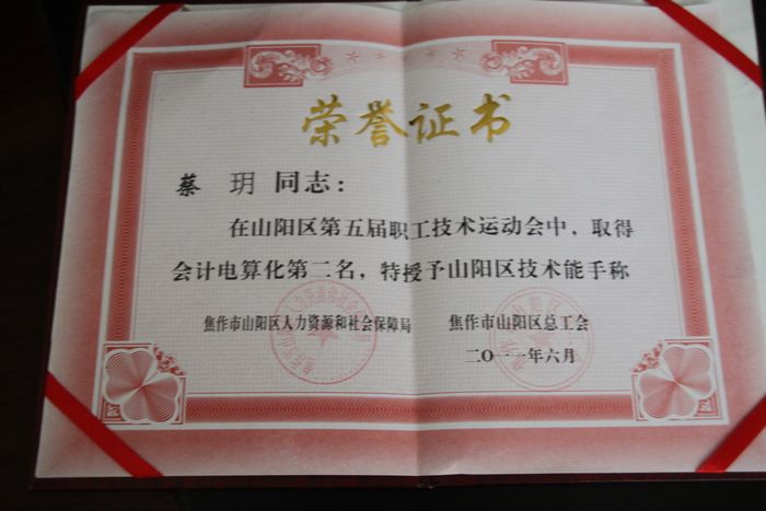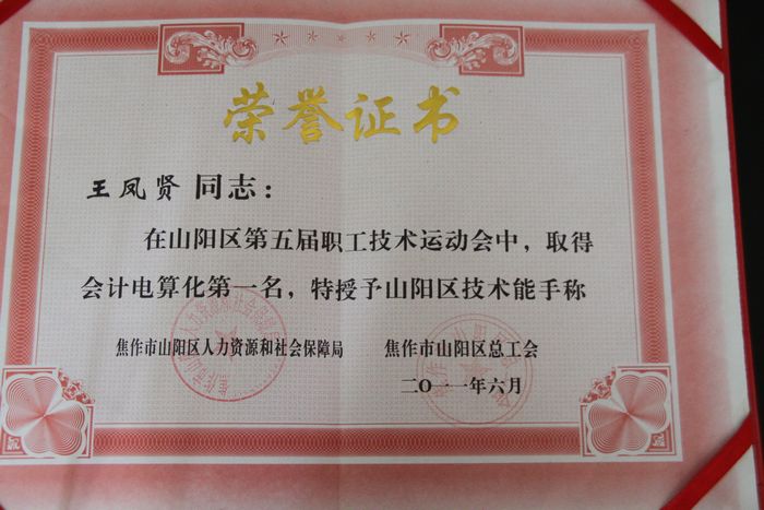 在山阳区总工会、山阳区人力资源和社会保障局联合开展的“山阳区第五届职工技术运动会”活动中,我公司共参与10余名职工,经过顽强拼搏,我公司职工王凤贤、蔡玥两位同志分获会计电算化项目比赛的第一、二名,受到了山阳区总工会的表彰。山阳区总工会还为获得第一名的王凤贤同志颁发了山阳区“五一劳动奖章”。